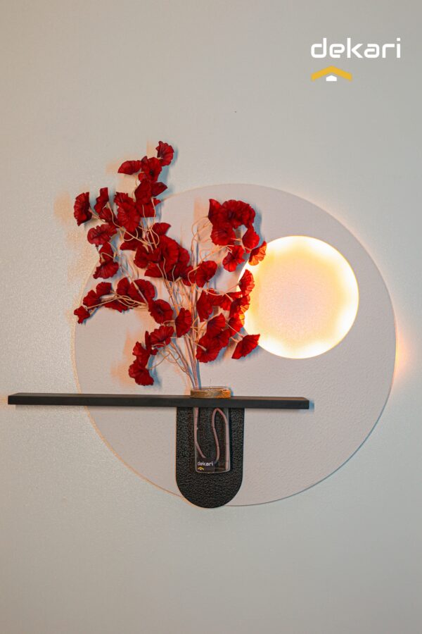 Sublimez votre intérieur avec ce tableau mural rond au design raffiné. Avec un diamètre de 60 cm et des dimensions totales de 80 x 60 cm, cette décoration murale intègre une lumière LED douce et chaleureuse qui fonctionne à piles, sans besoin de branchement électrique. Son vase transparent intégré accueille des branches décoratives pour une touche naturelle et moderne. Idéal pour une chambre, un salon ou une entrée.