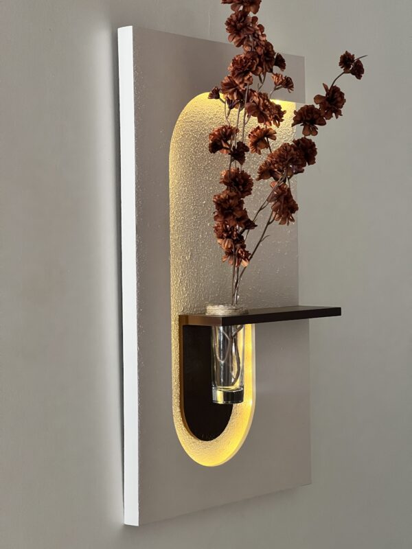 Élégante décoration murale moderne avec éclairage LED intégré et vase suspendu en verre. Un mélange de minimalisme et de sophistication pour sublimer votre intérieur.